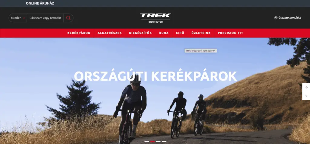 Modern, tiszta design, Trek márkaidentitással, kiemelt termékkategóriák, jól strukturált menürendszer.